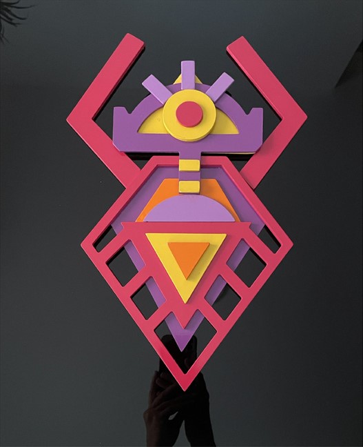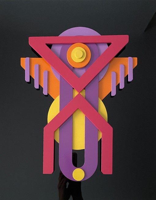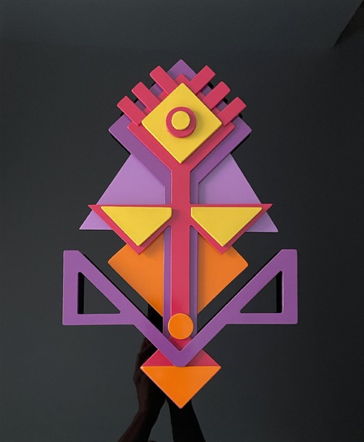 Elle s’efforce de préserver cette mémoire en réinterprétant le langage de signes graphiques à travers des tableaux et des sculptures colorées.